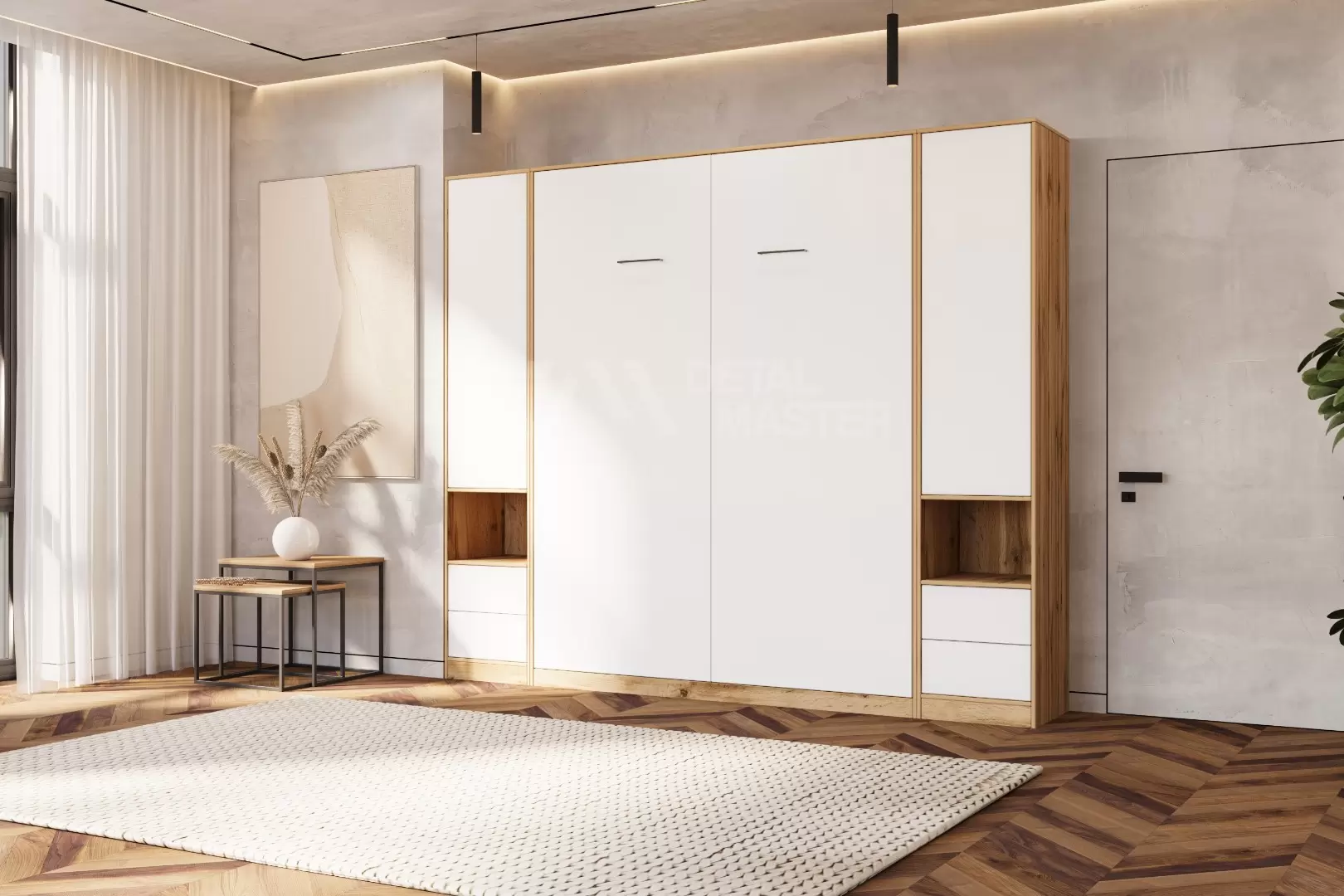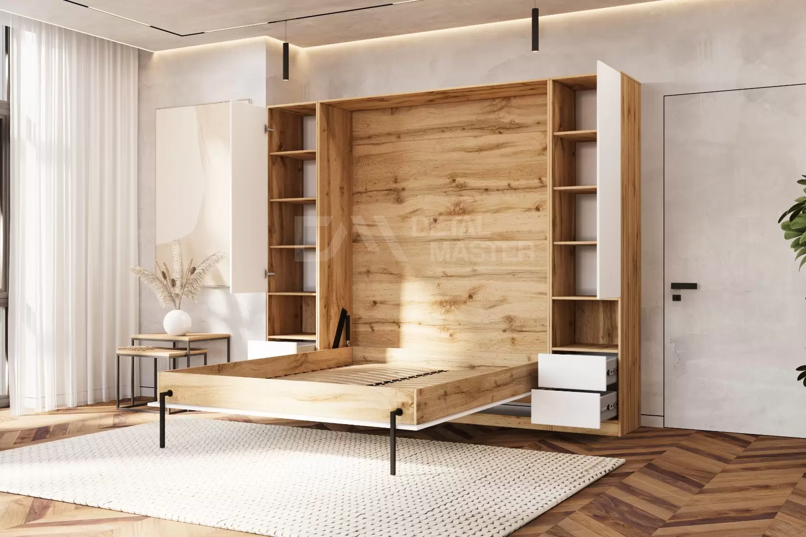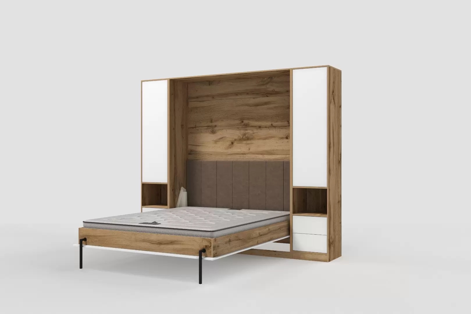 Шкаф-кровать "Extra Start" работает на механизме раскладывания собственной разработки "Start". Кровать раскладывается легким движением руки, превращаясь в полноценное спальное место. Просто потяните ее за ручки, расположенные на фасаде и выставите ножки-опоры.
