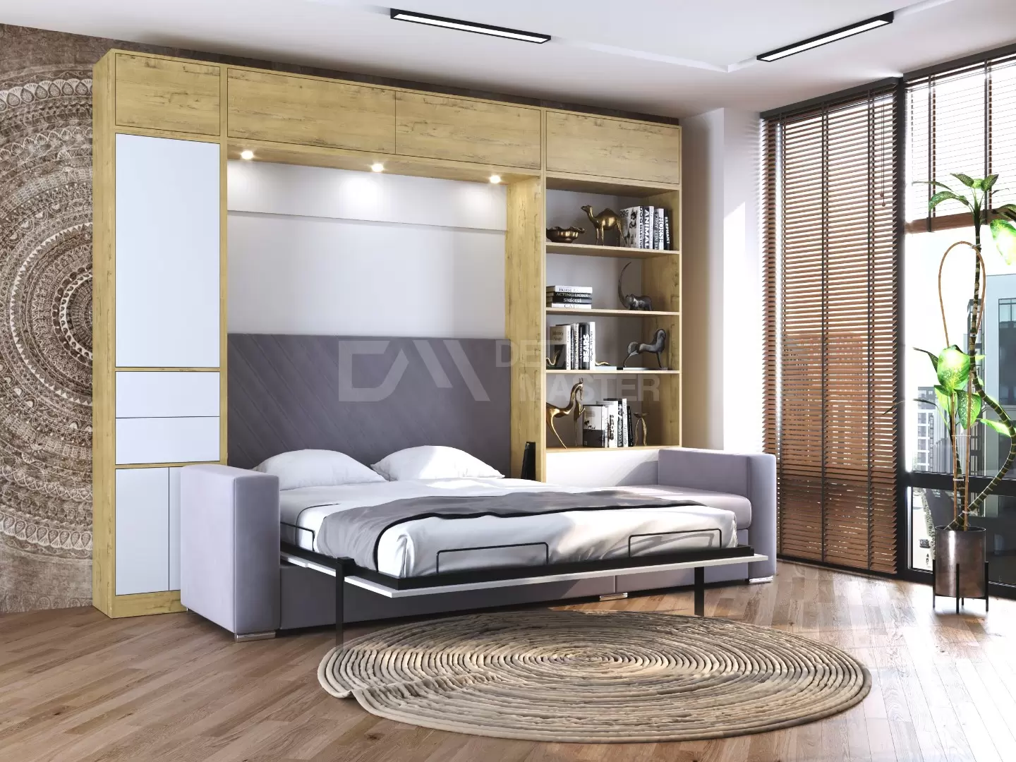 Фасад шкаф-кровати выполнен из  ЛДСП Белоснежный, корпус выполнен из ЛДСП  Сонома.