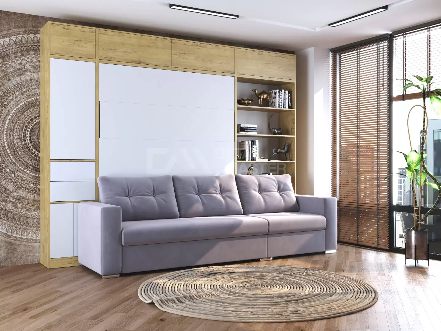 Шкаф-кровать трансформер с диваном "Urban Family Balance" работает на механизме раскладывания собственной разработки "Balance". Кровать раскладывается легким движением руки, превращаясь в полноценное спальное место. Просто потяните за ножку-маятник, которая самостоятельно фиксируется в нужное положение при опускании.